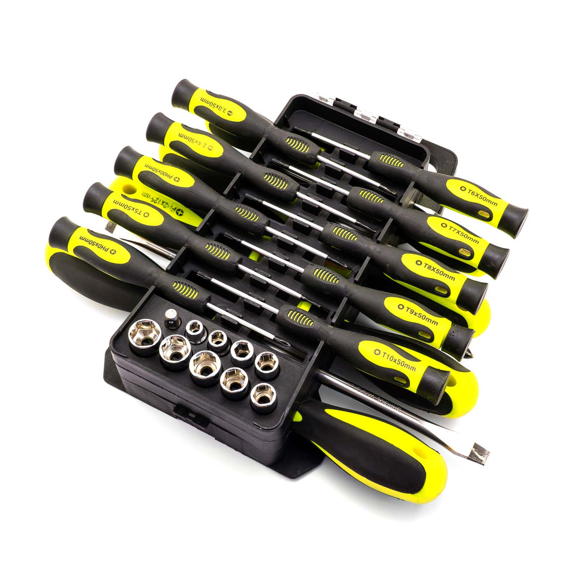 Upgrade your toolkit with the Black and Acid Yellow Screwdriver Set in Organizer Box and experience the perfect blend of style, functionality, and convenience. With its comprehensive selection of screwdrivers, durable construction, and eye-catching design, this set is sure to become an indispensable asset in your workshop arsenal. Elevate your projects and tackle tasks with confidence – get your hands on this exceptional screwdriver set today!