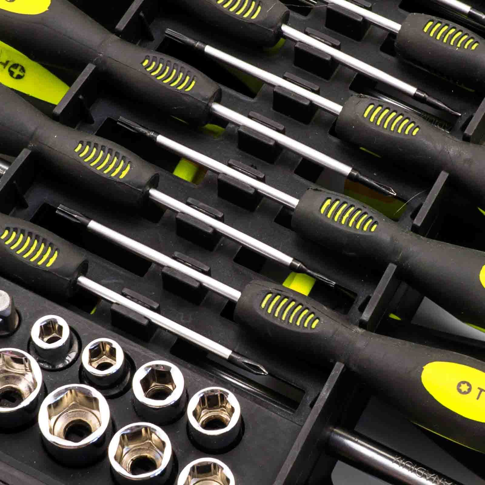 This set includes a range of screwdrivers for versatile use, all neatly stored for easy access and storage.